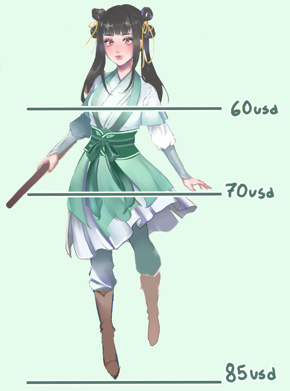 (example: if you commission me for one half-body character, it will be 70 USD. If you'd like two characters drawn, it will be 105 USD.)